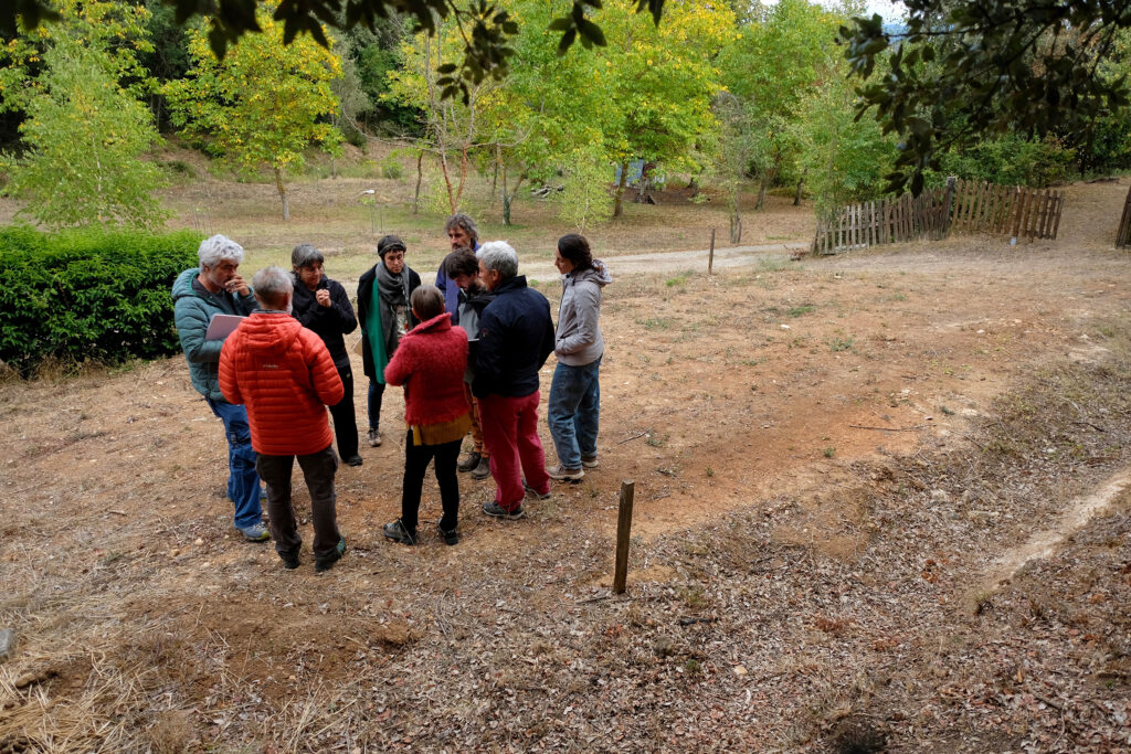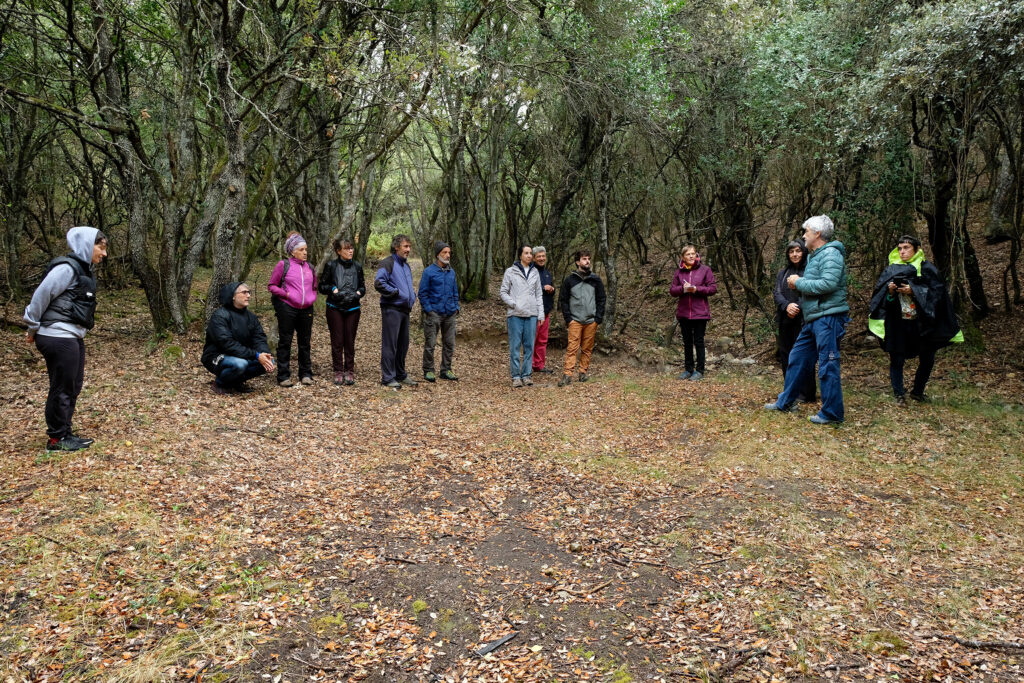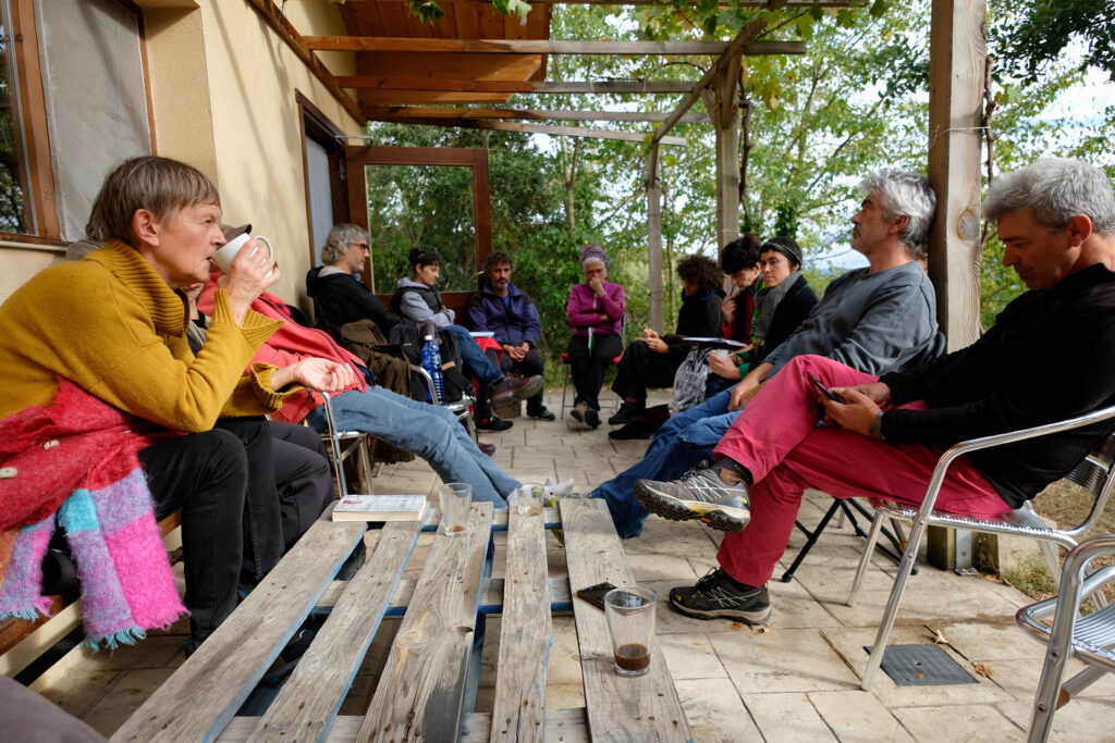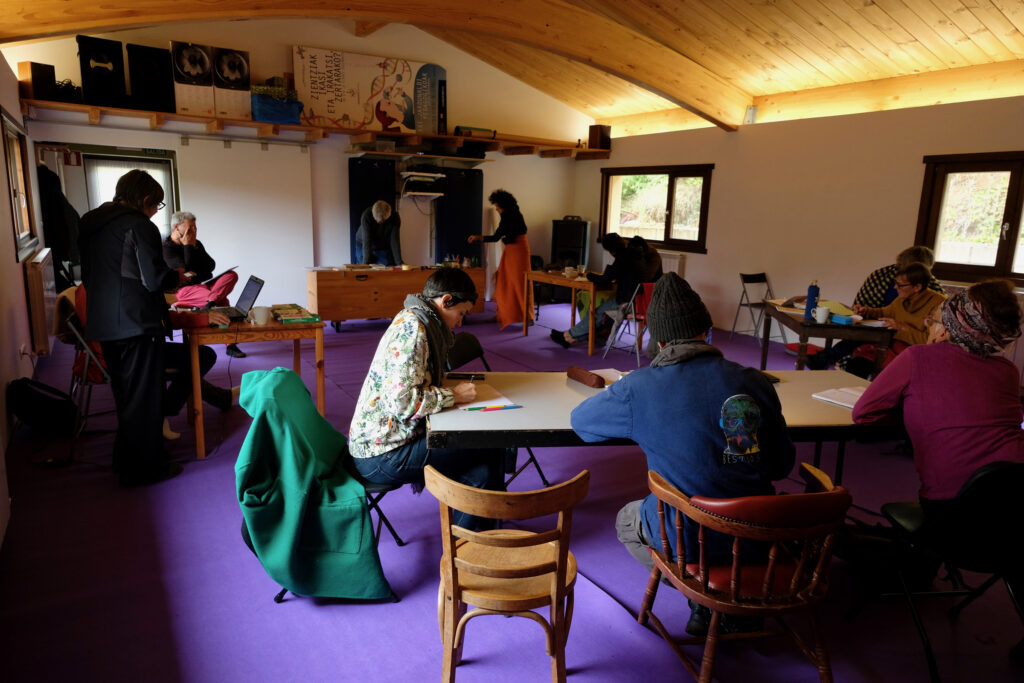 Os escribimos formalmente para invitaros a participar en el encuentro Silvestre escenario que tendrá lugar en Azala los días 24 y 25 de setiembre. El objetivo de este encuentro es ayudarnos a pensar en el pequeño escenario al aire libre que tenemos previsto construir este otoño, con una ayuda Next que hemos recibido del Gobierno Vasco. Si bien son Next y futuros sustentables lo que promulgan estas ayudas, este escenario a la intemperie es una idea antigua: desplazar el teatro al corral, desplazar el corral a la era, desplazar la era al monte. Un terreno contiguo al estudio pequeño, bajo la biblioteca, camino al antiguo manantial, frente a la recién repoblada nogalera, a las faldas de un encinar que en los últimos años ha padecido una plaga de Kermes ilicis, debilitando los peciolo de sus hojas. El terreno es propiedad de la junta administrativa de Lasierra y algunos vecinos apilan ahora allí la leña resultado de limpieza anual de los bosques. La suerte se llama a este modo de reparto de madera, que además de abastecer de combustible para la calefacción del invierno, ayuda a aclarar el monte y protegerlo en caso de incendio. Estos últimos años nos hemos adentrado más que nunca en el encinar, lo hemos reconocido (esos líquenes blancos en la corteza de las encinas que parecen tiza), nos ha reconocido (nuestras pisadas han reinscrito antiguas sendas), le hemos pedido permiso, hemos considerado que nos lo ha otorgado, nos hemos visto enfermar, mutuamente, también sanar. Hemos caminado de noche, hemos meado y también hemos seguido las pistas sobre la nieve de los meados de otros animales, hemos proyectado películas también fantasías y teatros de sombras, hemos parado a leer, en voz alta, y a cantar y a conversar en la asamblea de los pinos, hemos escuchado correr el agua y secarse, hemos matado moscas que nos han mosqueado mucho, hemos contemplado las copas por arriba y abajo, hemos contemplado las raices por abajo y arriba, nos hemos ido por las ramas, hemos construido escaleras y hemos pasado tiempo, mucho tiempo, tiempo de bosque, que es esa otra modalidad de tiempo.