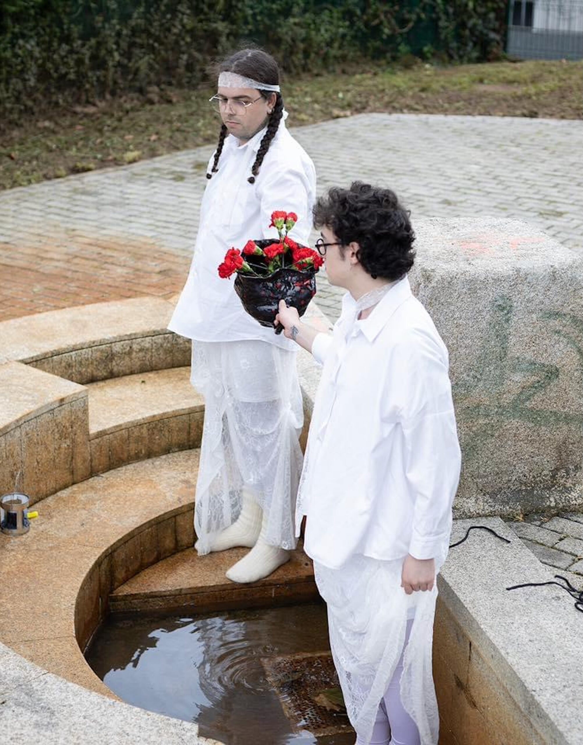 Aviva-lo. Sergio Marey y Alberto Ovejero forman este dúo artístico creado a comienzos de 2024. Un colectivo de reciente creación que nace con la voluntad de mezclar música y performance. Para ello, parten de la revisión de la música tradicional gallega, profundizando en su sentimiento y fusionándola con música electrónica. De este modo, generan un proyecto que hibrida cuerpo y sonido, haciendo que se retroalimenten y que ambos elementos sean capaces de generarse el uno al otro. Esta fusión interdisciplinar les permite así repensar lo tradicional siempre con una mirada queer, poniendo el foco en la disidencia. Desde su fundación han creado la obra “Teño un caravel no peito” («Tengo un clavel en el pecho»), que fue seleccionada para el FIOT – Festival Internacional de Otoño Teatral de Carballo y el FITO – Festival Internacional de Teatro de Ourense. Se trata de una propuesta para espacios no convencionales (fuentes de agua), que ahora llevarán a diferentes pueblos buscando poner en valor este patrimonio de arquitectura acuática. Además, el sonido generado en la pieza fue lanzado en octubre en formato EP y está disponible en todas las plataformas. También colaboraron en la instalación performativa “Deus te livre” («Dios te libre») que Sergio Marey realizó durante las Residencias REGA de la Cidade da Cultura.